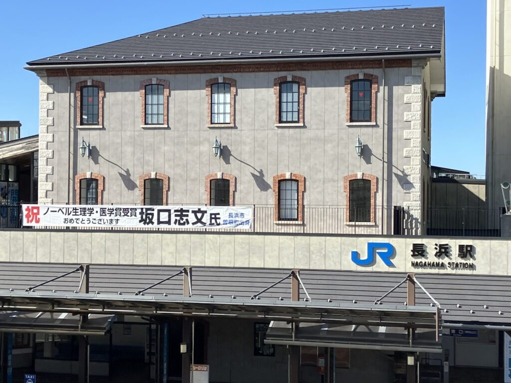 10月の歩こう会は、「長浜古跡めぐりと黒壁スクエアでランチ」と題し、来年のNHK大河ドラマ「豊臣兄弟!」を先取りし、豊臣秀吉ゆかりの地である長浜を散策しました。長浜市は、天正年間に羽柴秀吉が「今浜」を長浜に改名し、小谷城下などの商人たちを集めて、楽市である城下町を作ったのが、現在の基礎となっているそうです。また、開催日の2日前に今年のノーベル医学・生理学賞を受賞された坂口 志文先生(長浜生まれ)のお祝いの横断幕がJR長浜駅に掲げられていました。