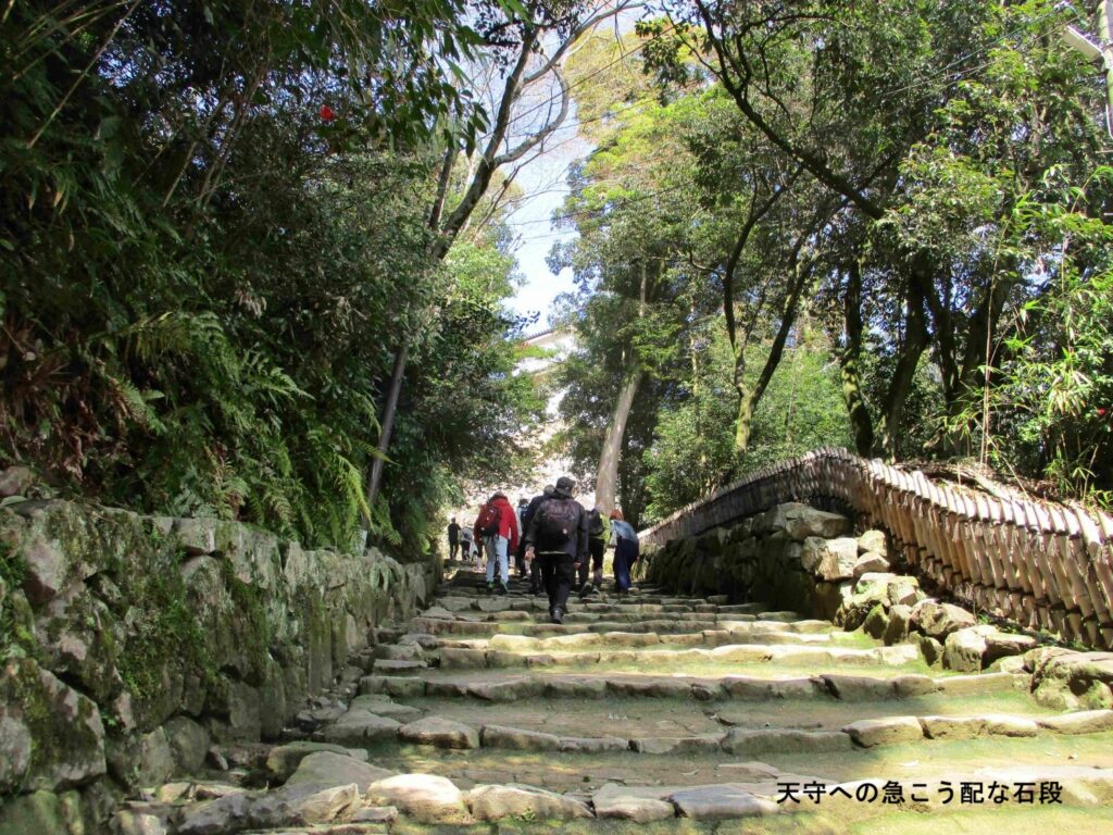 入場券を購入し、受付を通り抜けるといきなりの石段でした。石段は段に高低があり、幅も一定ではなく、城を攻める敵が一気に駆け上がれない工夫がされていました。結構な急こう配で息を切らしながら登った先に映画やテレビでよく見る天秤櫓がありました。櫓に向かう橋を渡り、太鼓門などを抜け天守に向かいました。天守の築城は1607年で、大津城を解体し移築したのだそうです。天守付近も桜が満開で国内外の多くの観光客が写真を撮っていました。無論、私たちも桜と天守をバックに撮りました。そして天守に登りましたが結構混雑しており、展示物をゆっくり鑑賞する余裕はなく登り下りしただけという状況でした。