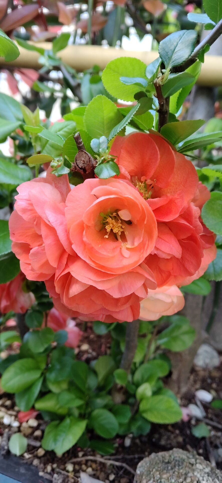 ボケはバラ科ボケ属の落葉低木です。日本に自生するボケはクサボケと言われる同属の植物です。果実が瓜に似ており、木になる瓜で「木瓜」(もけ)と呼ばれたものが転訛して「ボケ」となったようです。原産地は中国で日本には平安時代に渡来し観賞用に栽培された帰化植物です。温暖地で良く育ちボケの名所では鎌倉の「九品寺」が有名です。江戸時代小石川療養所にボケが植えられ漢方薬として使われました。果実には補血、強壮、疲労回復、咳止め、食あたりなどの効用があるためのようです。。我が家のボケは近所の方に頂き挿し木したもので庭の隅で春になるとささやかに咲いています。最初梅の仲間と思いましたが違うようで花をみればとても力強さを感じます。